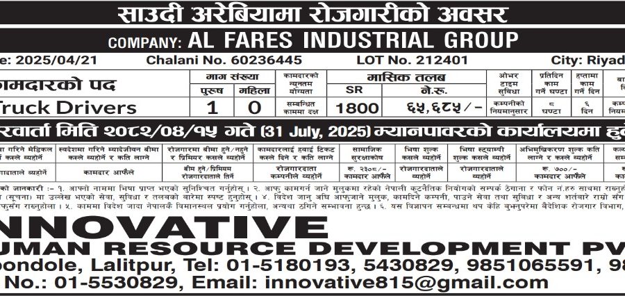 Innovative HRD (P) Ltd. is extremely happy to introduce our reputation and credibility in the international recruitment field to our sourcing Nepalese Human resources and consequently requests that you appoint us your Recruitment Agent.
